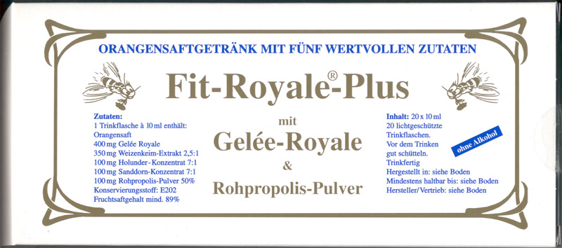 mit Gelee Royale und Propolis-Pulver 20 Trinkfläschchen a 10ml 1 Trinkflasche enthält: Orangensaft 400 mg Gelee Royale 350 mg Weizenkeim-Extrakt 100 mg Holunder-Konzentrat 100 mg Sanddorn-Konzentrat 100 mg Rohpropolis-Pulver Konservierungsstoff: E202 Als Besonderheit enthält Fit-Royale-Plus